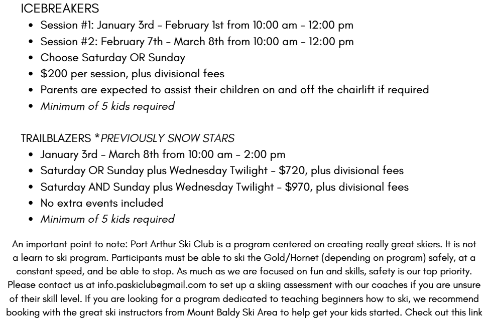 *We strive to provide programming on all days indicted. Unfortunately, there will be some circumstances where we may not be able to provide on-hill programming (dependent on Mount Baldy operations, weather, etc). We will aim to offer alternate forms of programming during these times (eg. dryland, various ski related training)